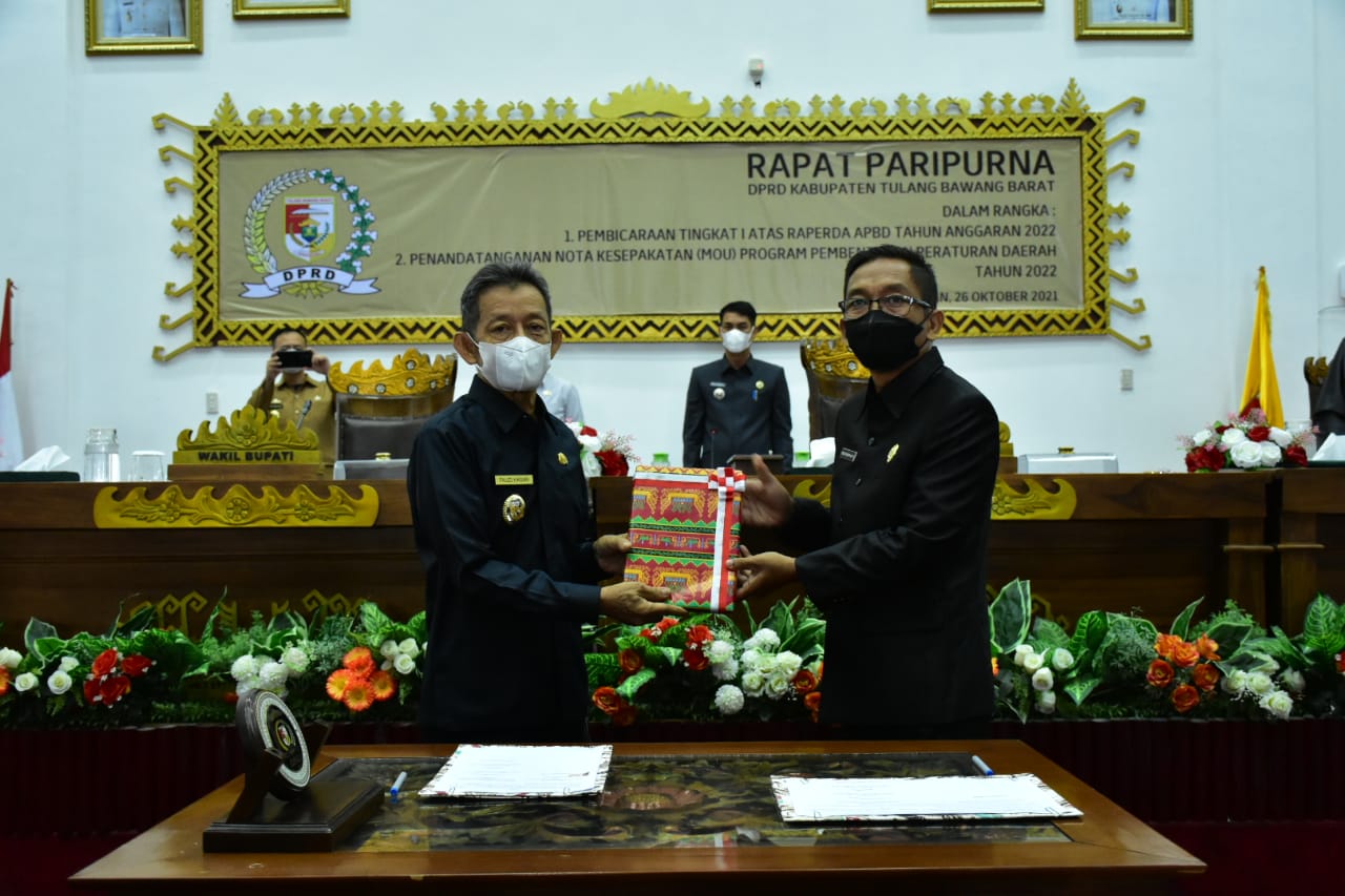 TuBaBa, Cyberkatulistiwa.com – Rapat Paripurna Pembicaraan Tingkat I atas Raperda APBD Tahun Anggaran 2022 dan Penandatanganan Nota Kesepakata (MoU) Program Pembentukan Perda Tahun 2022, di Ruang Paripurna DPRD Tulang Bawang Barat. Selasa (26/10/2021).