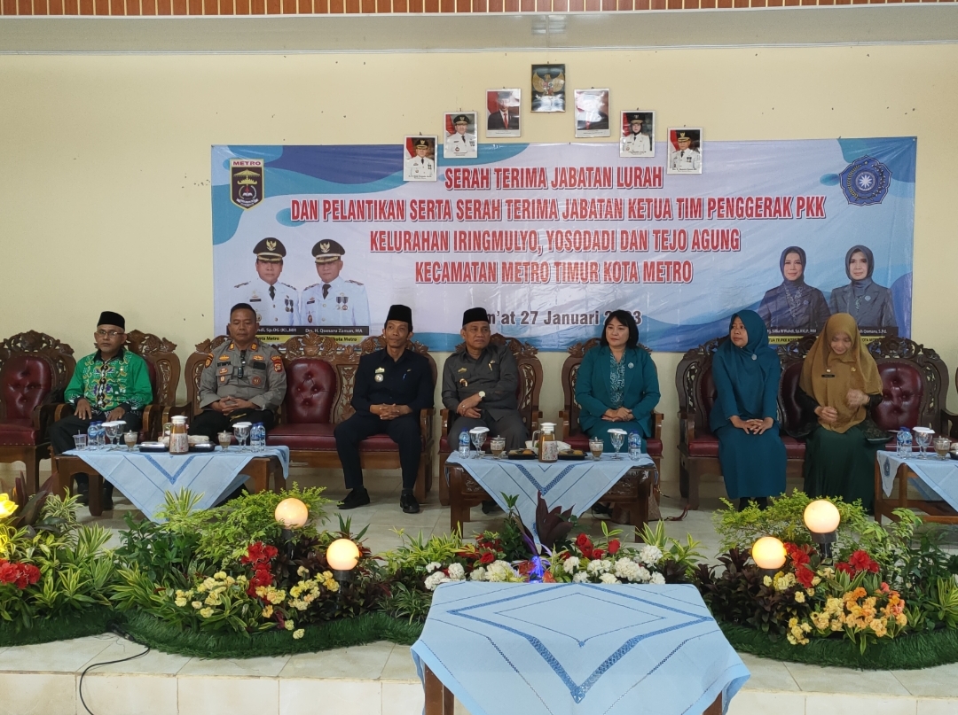 Metro, Cyberkatulistiwa.com – Kecamatan Metro Timur mengadakan acara Serah Terima Jabatan (Sertijab) Jabatan Ketua Tim Penggerak PKK, Lurah Iringmulyo, Lurah Yosodadi, Lurah Tejo Agung di Aula Kecamatan Metro Timur, Jum’at (27/01/2023).