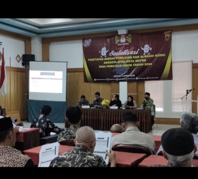 Metro, Cyberkatulistiwa.com – Komisi Pemilihan Umum (KPU) Kota Metro menggelar Sosialisasi Penetapan Daerah Pemilihan dan Alokasi Kursi Anggota DPRD Kota Metro pada Pemilihan Umum 2024, di Ballroom Hotel Grand Sekuntum Metro, Kamis (6/4/2023).