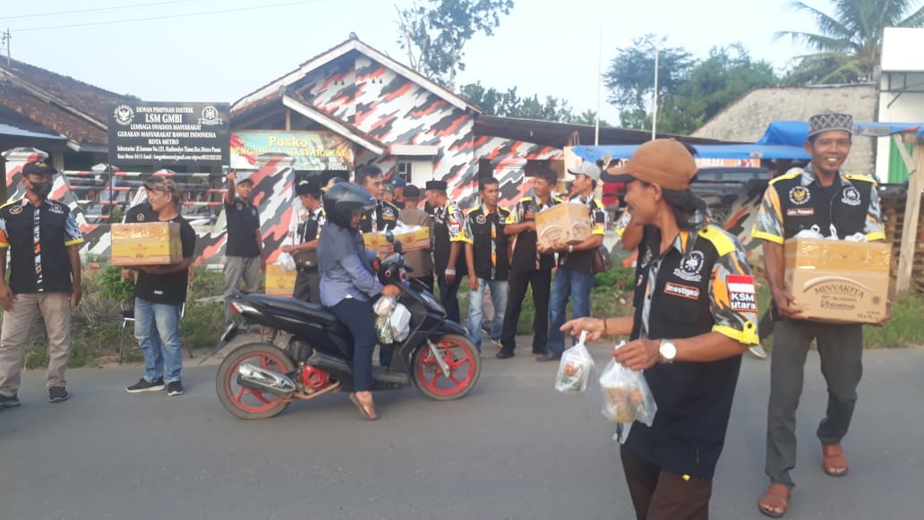 Sebanyak ratusan paket takjil yang dibagikan LSM GMBI Distri Kota Metro yang ditujukan untuk masyarakat yang akan berbuka puasa, kegiatan sosial berbagi takjil tersebut terbagi di dua titik lokasi yakni di TPA Al – Anwar Kelurahan Imopuro, Kecamatan Metro Pusat, dan di depan Sekretariat LSM GMBI Distrik Kota Metro yang beralamat di Jalan dr. Soetomo Kelurahan Hadimulyo Timur, Kecamatan Metro Pusat.