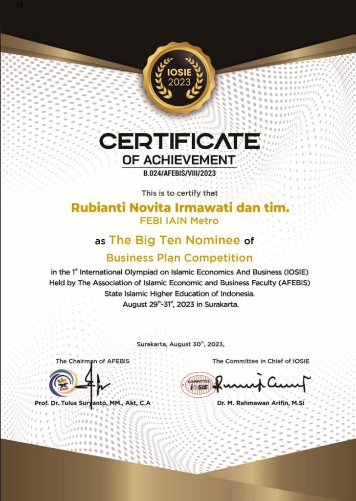Bukan hanya itu saja, dalam kegiatan IOSIE di Surakarta, tim dari FEBI IAIN Metro lolos sebagai Finalis sebagai top 10 dalam beberapa kategori, diantaranya Karya Tulis Ilmiah (AKS), Bussines Plan (PBS), Photographer & Fashion Show (ESY), dan Poster Kampanye Ekonomi Islam (Esy).