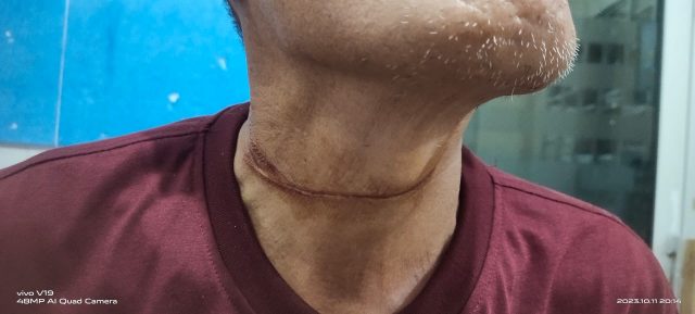 tiba tiba ada tali benang melilit lehernya, sehingga mengalami luka goresan seperti kena sayat pisau.