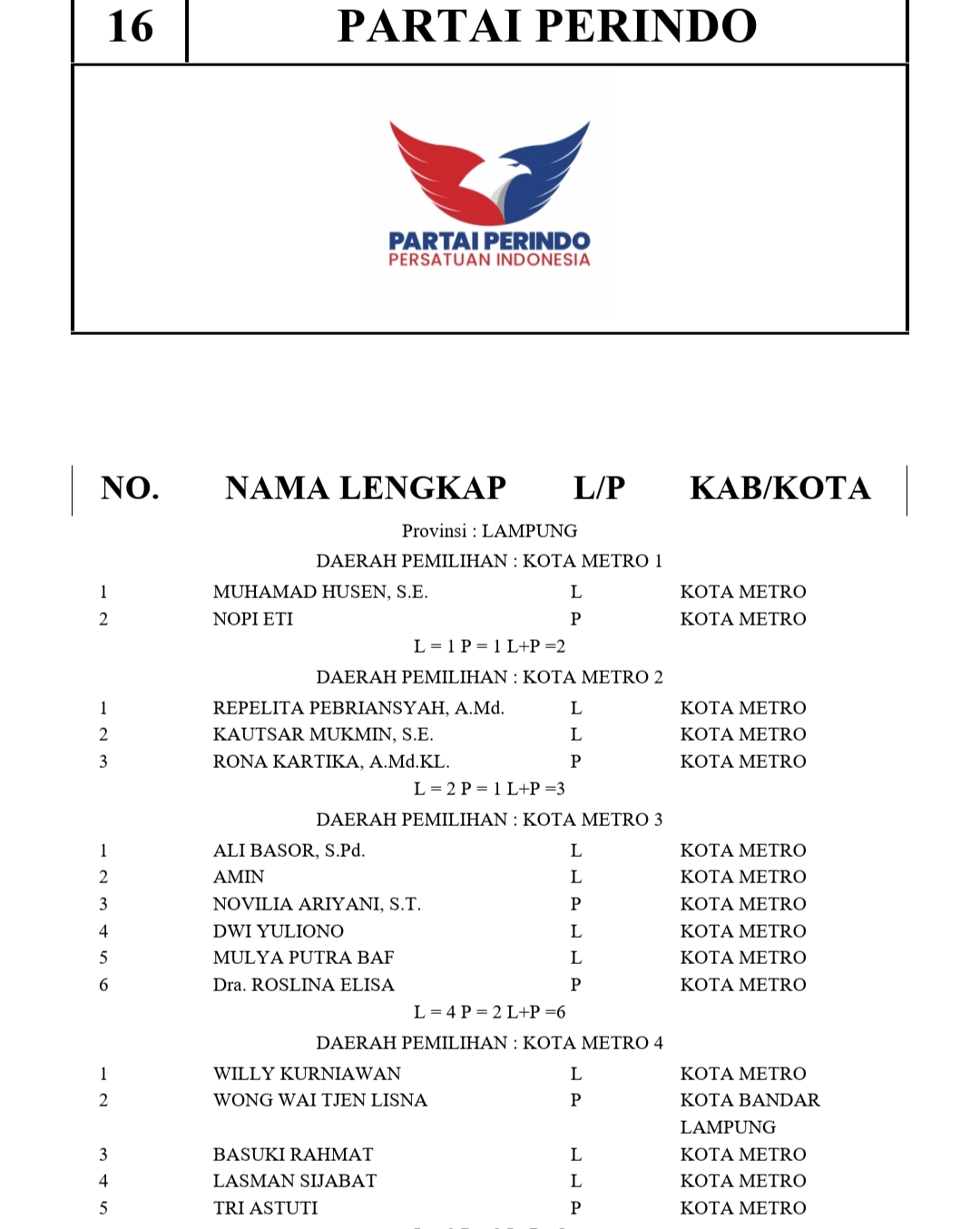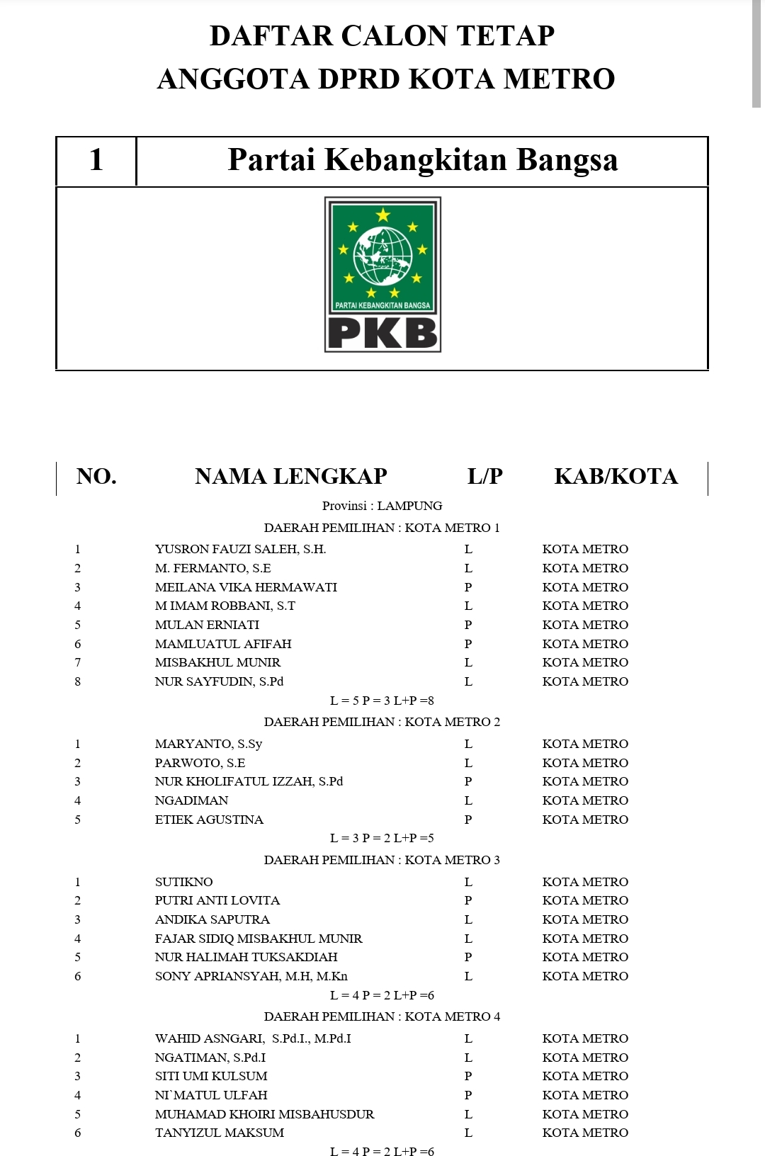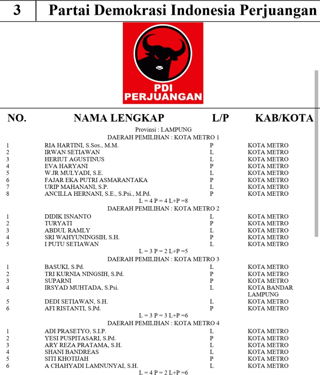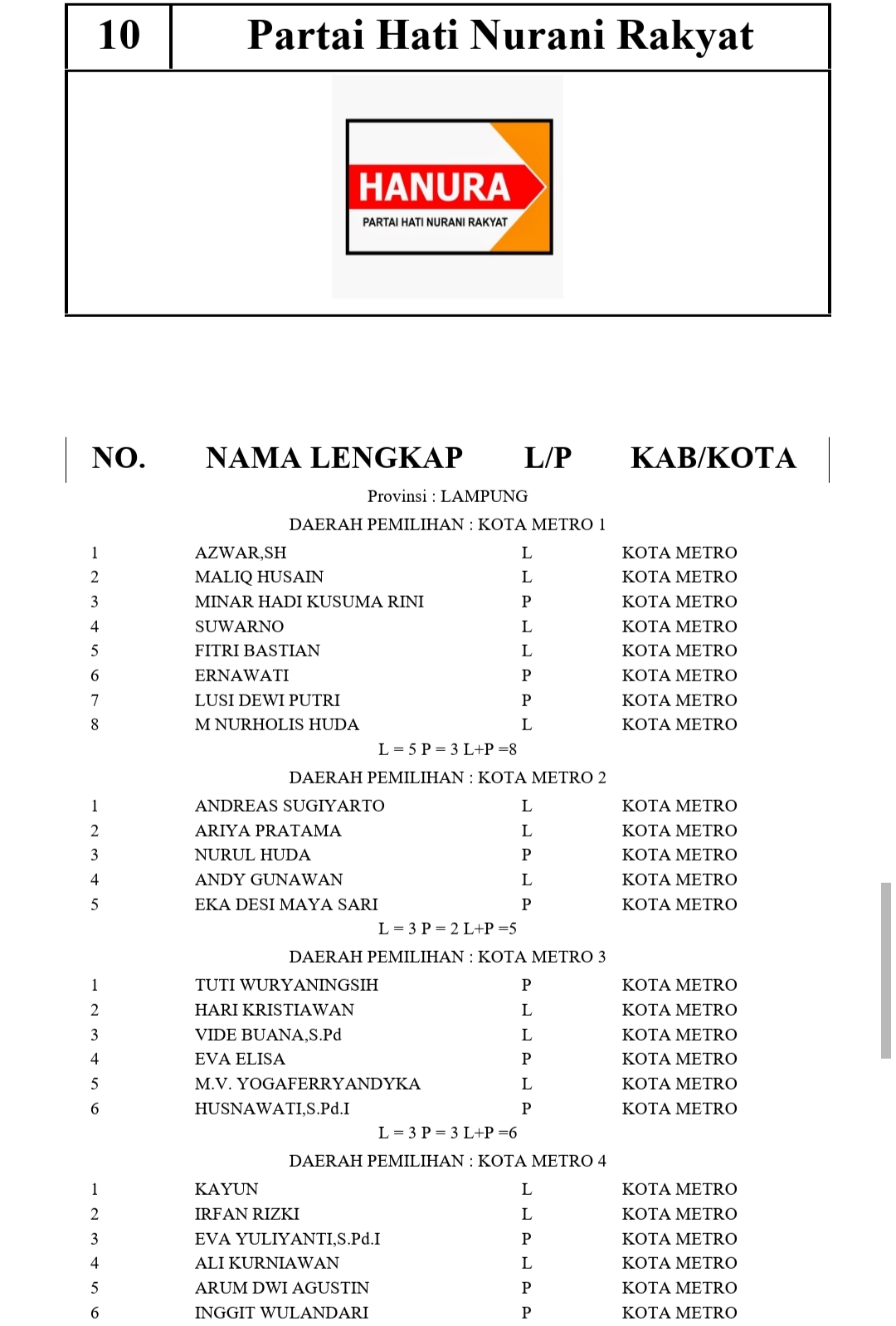 Daftar Calon Tetap Anggota DPRD Kota Metro Tahun 2024