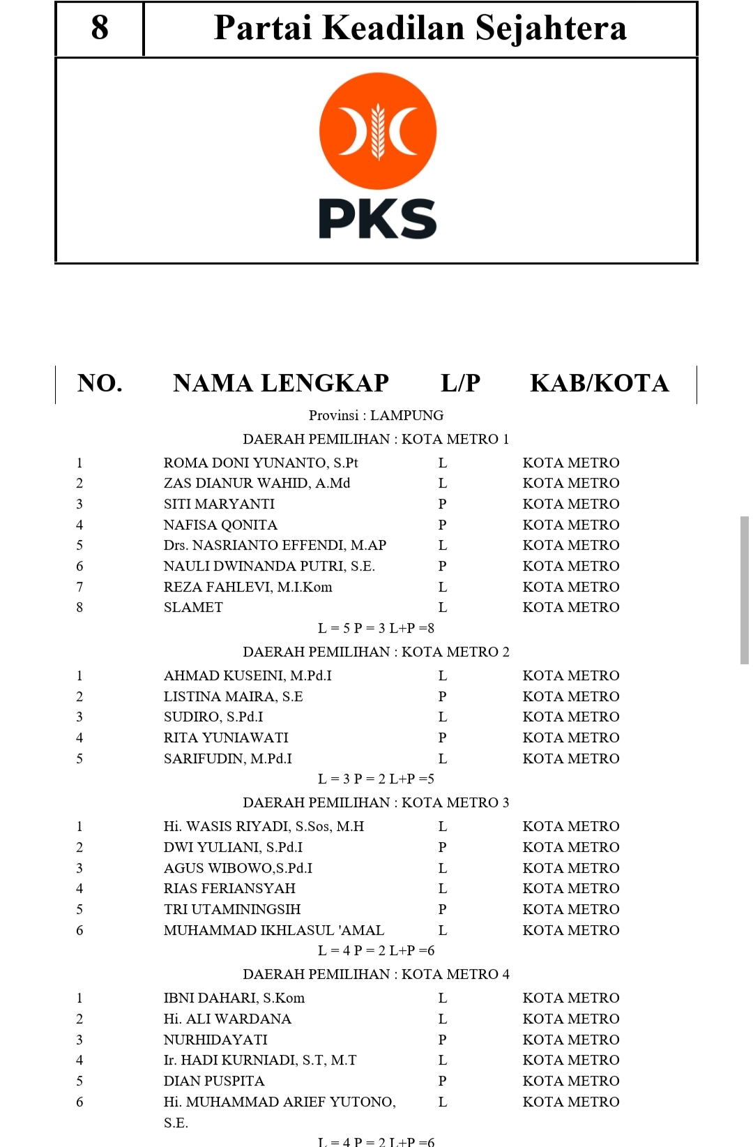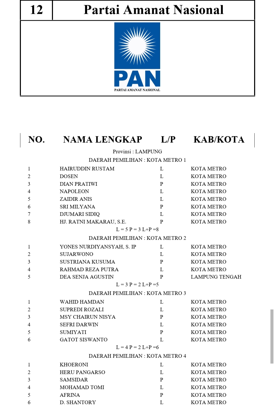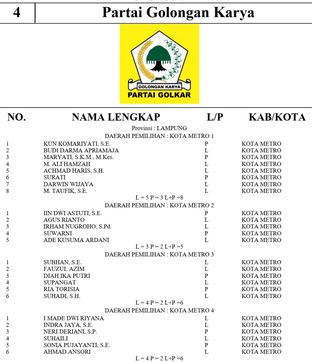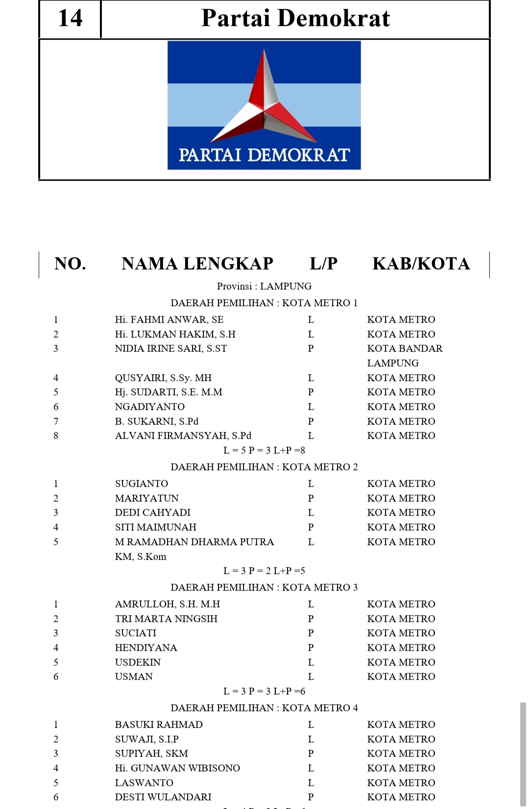 Daftar Calon Tetap Anggota DPRD Kota Metro Tahun 2024