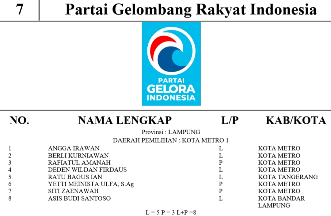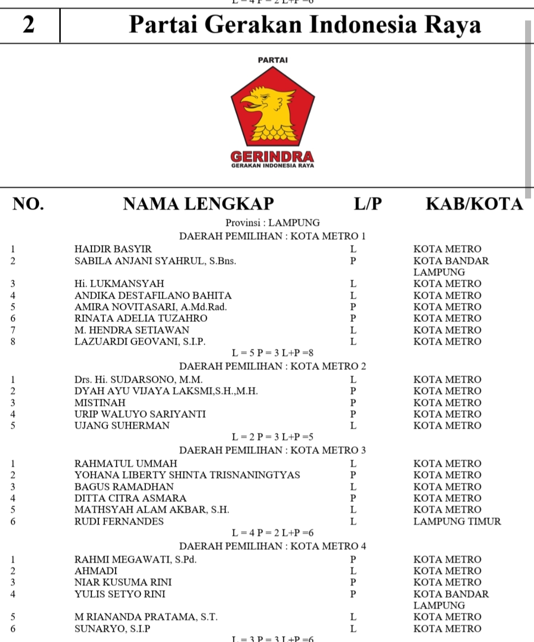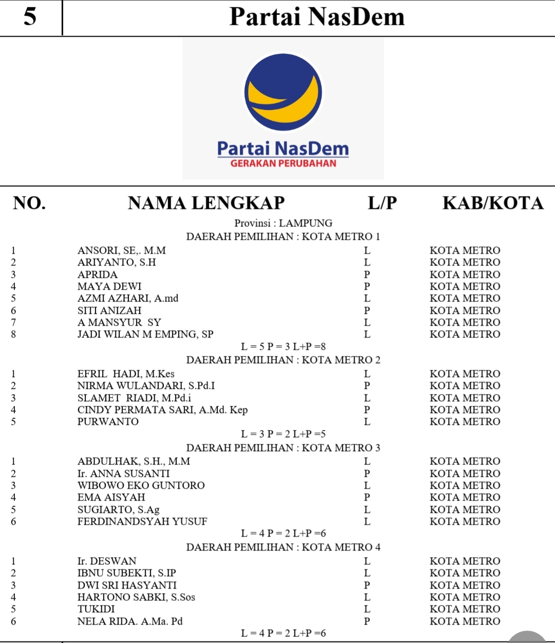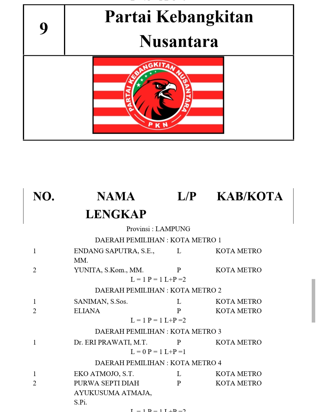 Daftar Calon Tetap Anggota DPRD Kota Metro Tahun 2024