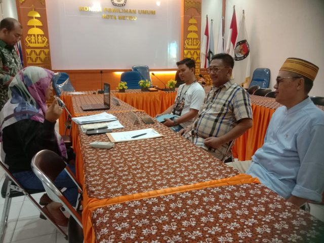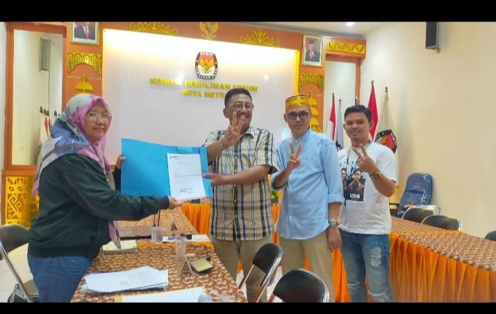Metro, Cyberkatulistiwa.com — Tim kampanye daerah Kota Metro pemenang Prabowo Gibran yang pertama menyerahkan berkas pendaftaran ke komisi pemilihan umum Bumi Sai Wawai , pendaftaran berlangsung di gedung KPU setempat , Jum’at 24/11/2023.
