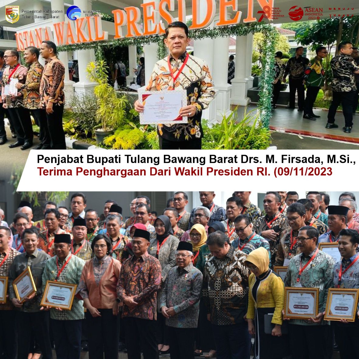 Tubaba, Cyberkatulistiwa.com – Wakil Presiden Republik Indonesia Prof. Dr. (H.C.) K.H. Ma’ruf Amin, memberikan secara langsung piagam Penghargaan Insentif Fiskal Kinerja kepada Penjabat (Pj) Bupati Tulangbawang Barat (Tubaba) Drs. M. Firsada, M.SI., yang dilaksanakan di Istana Wakil Presiden Jl. Medan Merdeka Selatan, Jakarta, Kamis (09/11/2023).
