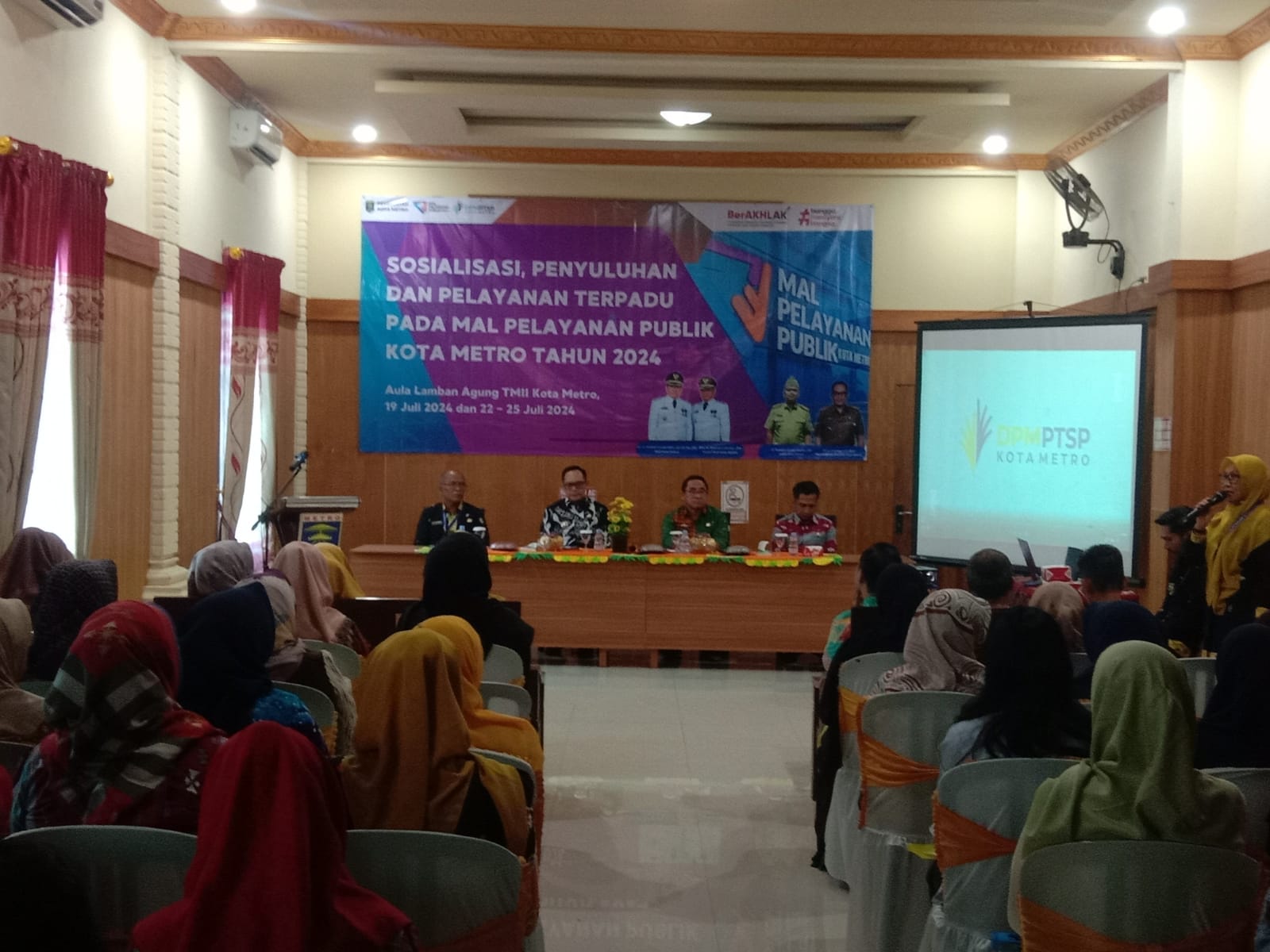 Metro, Cyberkatulistiwa.com — Untuk meningkatkan kualitas dan mengevaluasi pelayanan perizinan, Dinas Penanaman Modal dan Pelayanan Terpadu Satu Pintu (DPMPTSP) mengadakan kegiatan sosialisasi, penyuluhan dan pelayanan terpadu pada Mall pelayanan publik, di Aula Lamban Agung TMII kota setempat 19/7/2024.