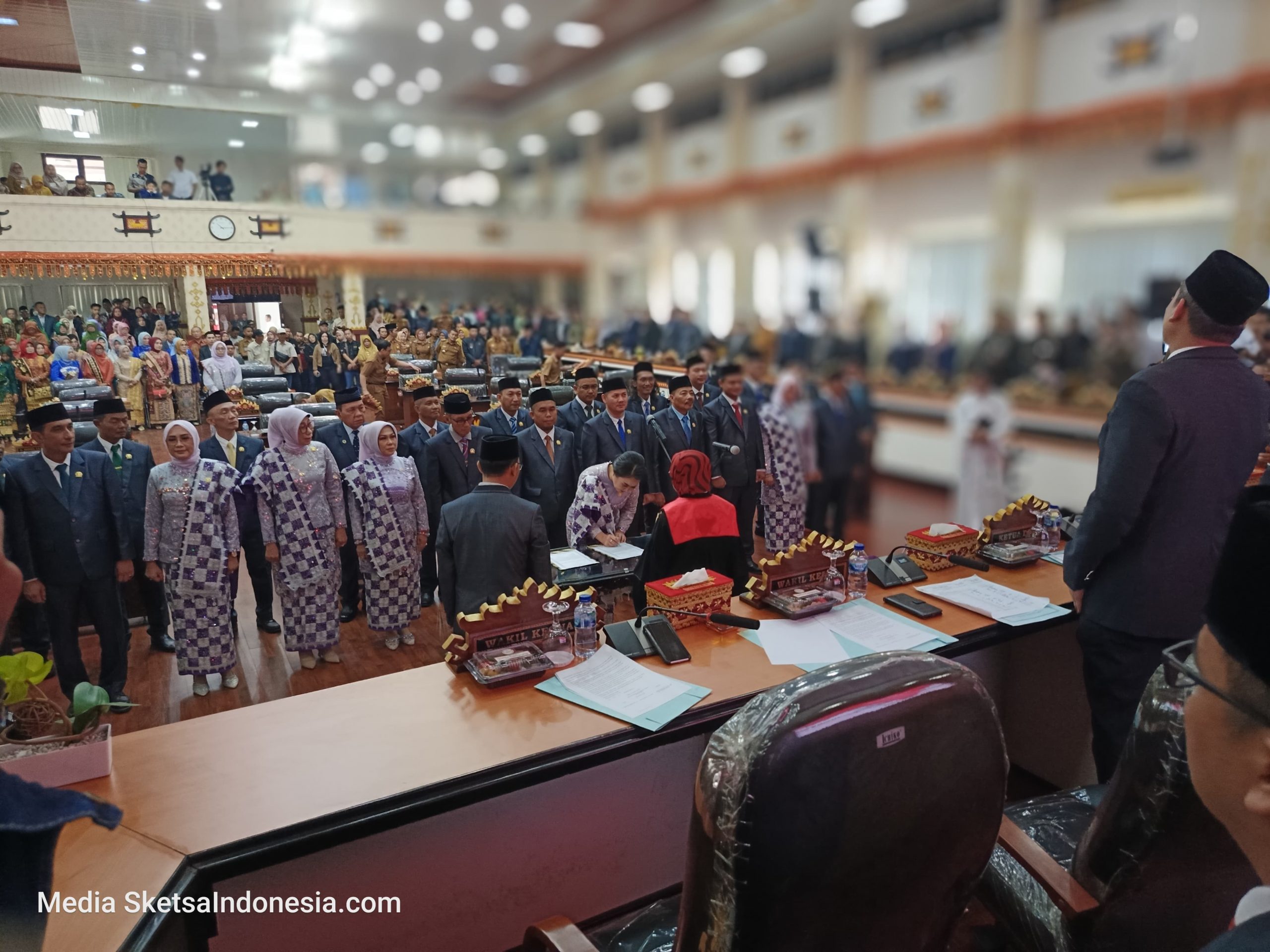 “Satu, undang-undang nomor 23 tahun 2014 tentang pemerintahan daerah sebagaimana diubah terakhir dengan undang-undang undang-undang nomor 6 tahun 2023. Dua, peraturan pemerintah nomor 12 tahun tentang pedoman penyusunan tata tertib dewan perwakilan rakyat daerah provinsi kabupaten dan kota,” ucapnya membacanya isi naskah pelantikan.