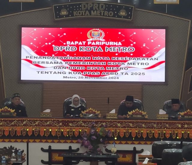Metro, Cyberkatulistiwa.com – DPRD Metro menggelar rapat Paripurna penandatanganan Nota kesepakatan bersama Pemerintah Kota Metro dan DPRD Kota Metro tentang kebijakan umum anggaran serta Prioritas dan Plafon anggaran sementara (KUA-PPAS) APBD Tahun Anggaran 2025 di ruang sidang DPRD Kota Metro Jalan AH Nasution no.139 Kelurahan Yosodadi Kot Metro, Rabu (20/11/2024).
