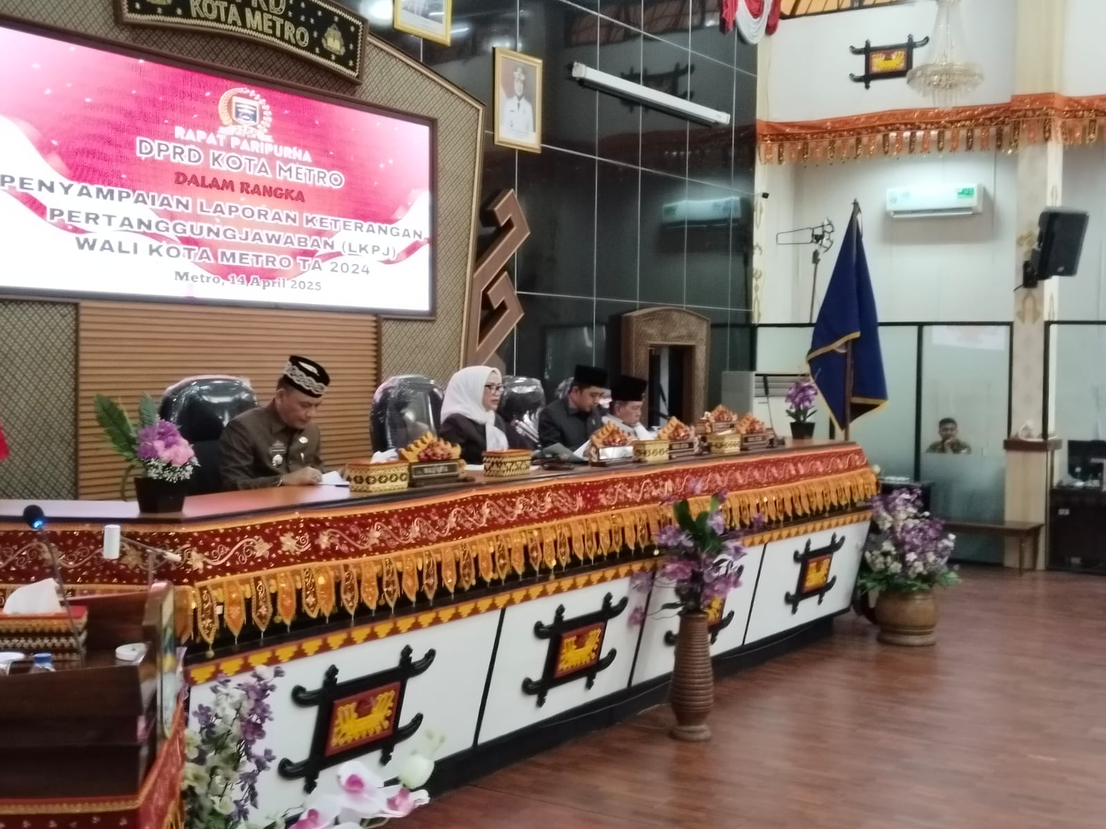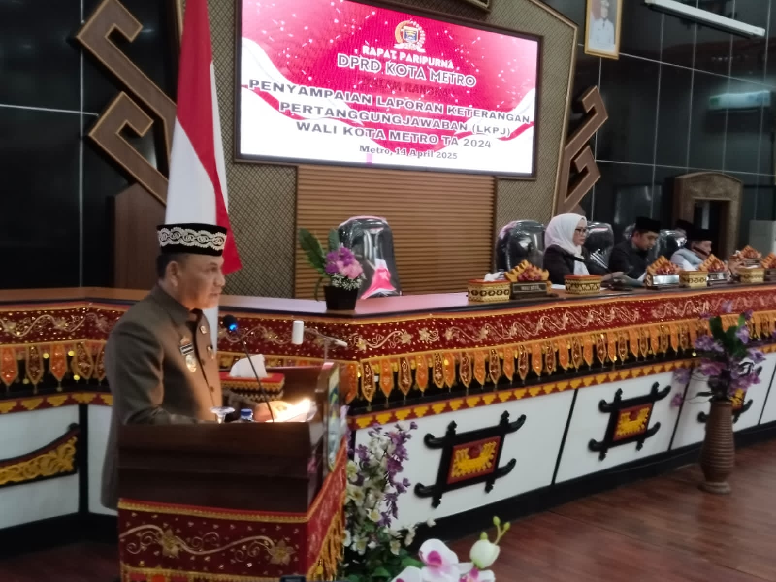 Metro, Cyberkatulistiwa.com — Walikota Metro, Bambang Iman Santoso, menyampaikan Laporan Keterangan Pertanggungjawaban (LKPJ) Tahun 2024 dalam rapat paripurna di DPRD Kota Metro, Senin (14/05/2025). Laporan tersebut mencakup capaian program pemerintah selama tahun keempat pelaksanaan RPJMD 2021-2026.