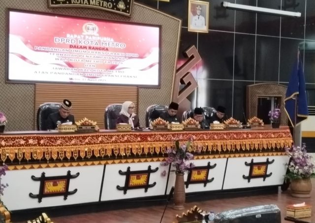 METRO, CyberKatulistiwa.com – DPRD Kota Metro menggelar Rapat Paripurna terkait Pandangan Umum Fraksi-Fraksi DPRD terhadap Penyampaian LKPJ Wali Kota Metro Tahun 2024 di ruang rapat paripurna DPRD setempat, Kamis (17/4/2025).