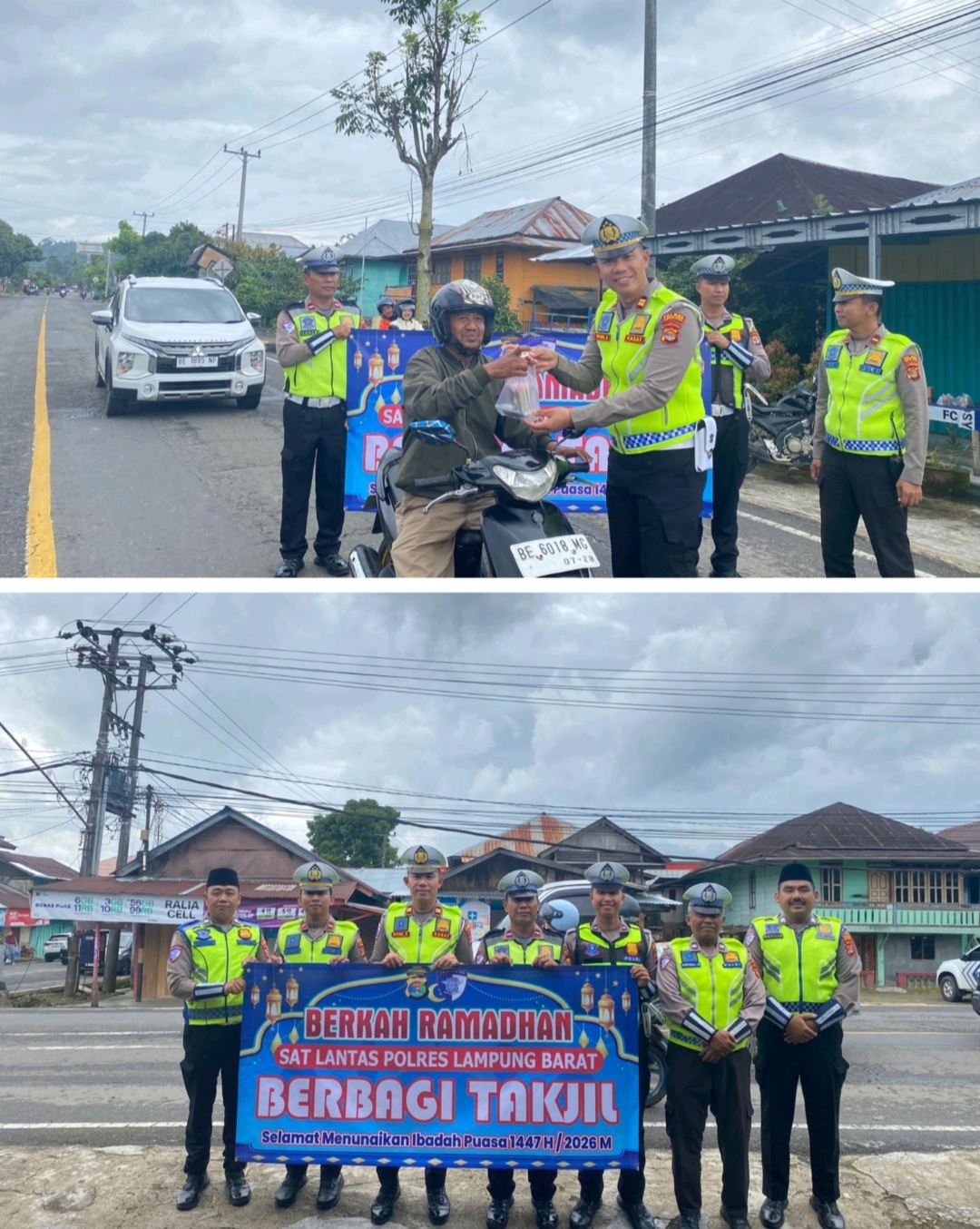 Lambar, Cyberkatulistiwa.com – Dalam rangka wujud untuk mencari keberkahan bulan Ramadhan 1447 H Satlantas Polres Lampung Barat Polda Lampung menggelar berbagi takjil untuk masyarakat. Senin 23 Febuari 2026.